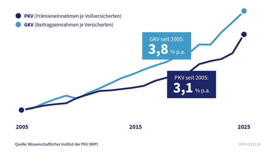 Ein Blick auf die langfristige Beitragsentwicklung in der GKV und PKV zeigt: Zwischen 2005 und 2025 sind die Beitragseinnahmen je Versicherten in der PKV im Schnitt um 3,1 % pro Jahr gestiegen – in der GKV lag der jährliche Zuwachs mit 3,8 % leicht darüber.