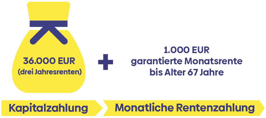 Beispielrechnung: Stand 01.2023, Wirtschaftswissenschaftler, Alter 27 Jahre, Nichtraucher, Bürotätigkeit, Versicherungsendalter 67 Jahre. Cash+3: Einmalige Kapitalzahlung (6.000 EUR bis 72.000 EUR) in Höhe von drei Jahresrenten bis zum 50. Lebensjahr, danach Kapitalzahlung in Höhe von einer Jahresrente bis Ende der Versicherungsdauer, garantierte Rentenzahlungen (in Höhe von 500 EUR bis 2.000 EUR). Cash+1: Einmalige Kapitalzahlung (6.000 EUR bis 90.000 EUR) in Höhe von einer Jahresrente über die gesamte Versicherungsdauer, garantierte Rentenzahlungen (in Höhe von 500 EUR bis 7.500 EUR).